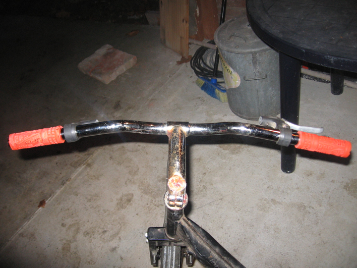voila mon solex avant de le "prépparé" pendant cet hiver !! pour linstant j ai juste adapté un quidon de velo et avec sa potence , et ces poignée orange ( un delire avec un pote !! )!!