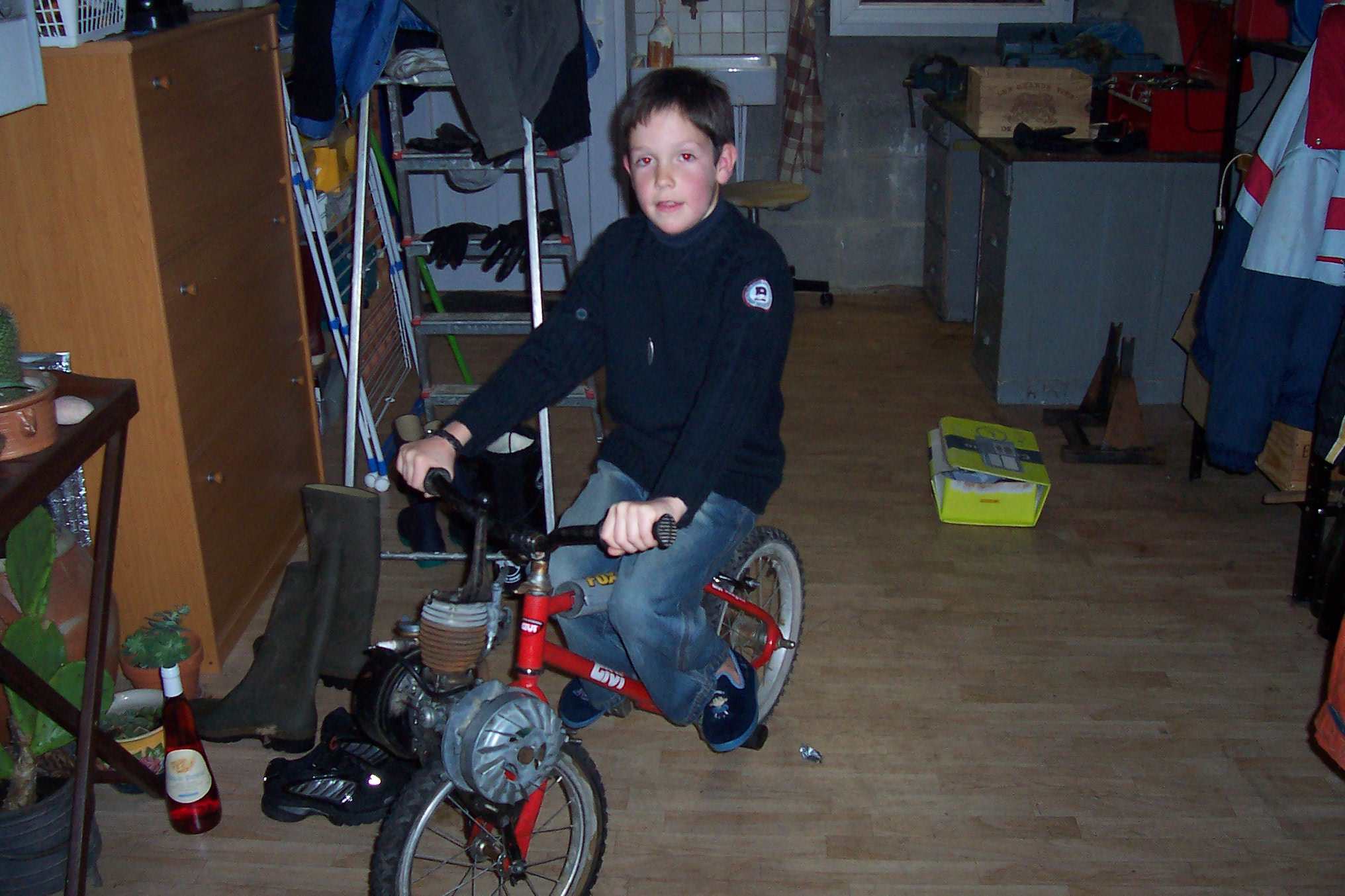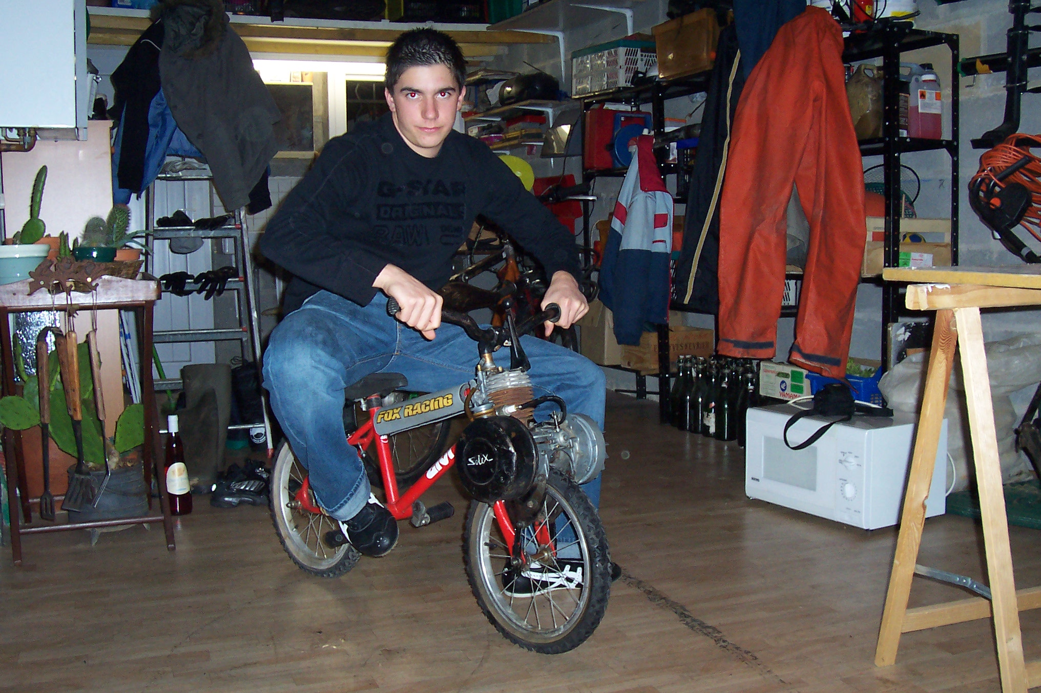 voici le brêlon la mascotte de la team " les bielles en feu ". un cadre de vélo d'enfant sans pédalier ni chaine avec seulement des cales pieds le frein arrière et une cirette.Des pattes de fixation maison et un peti moteur origine préparé.