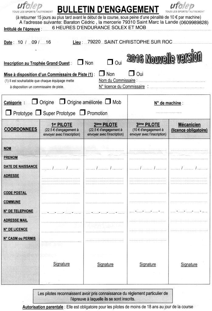Ci-joint l'engagement de St Christophe sur Roc (endurance 6H) le 10/09/2016: