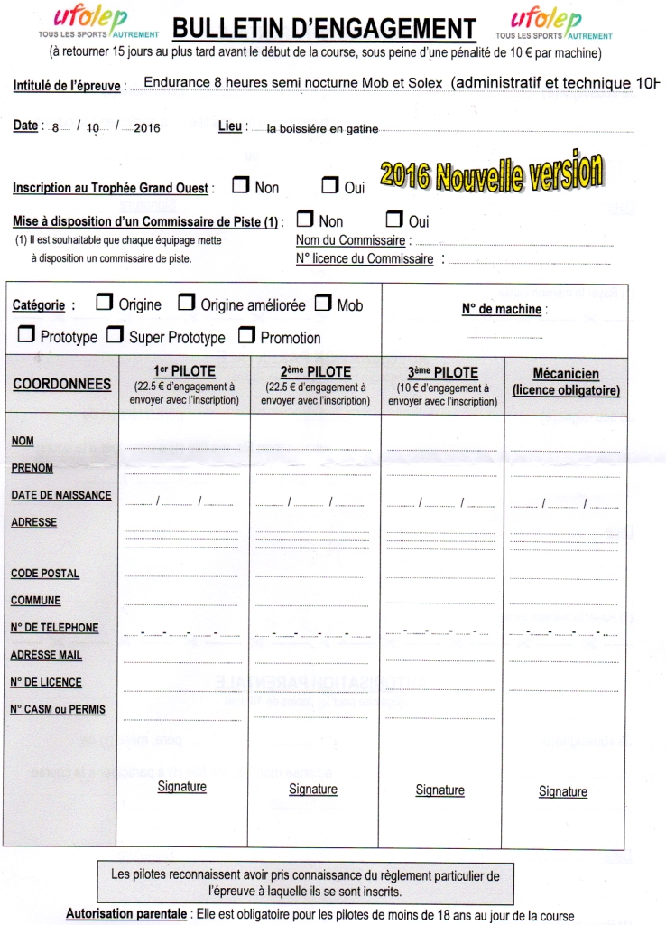 Ci-joint l'engagement de La Boissière (endurance 8H) le 08/10/2016:
