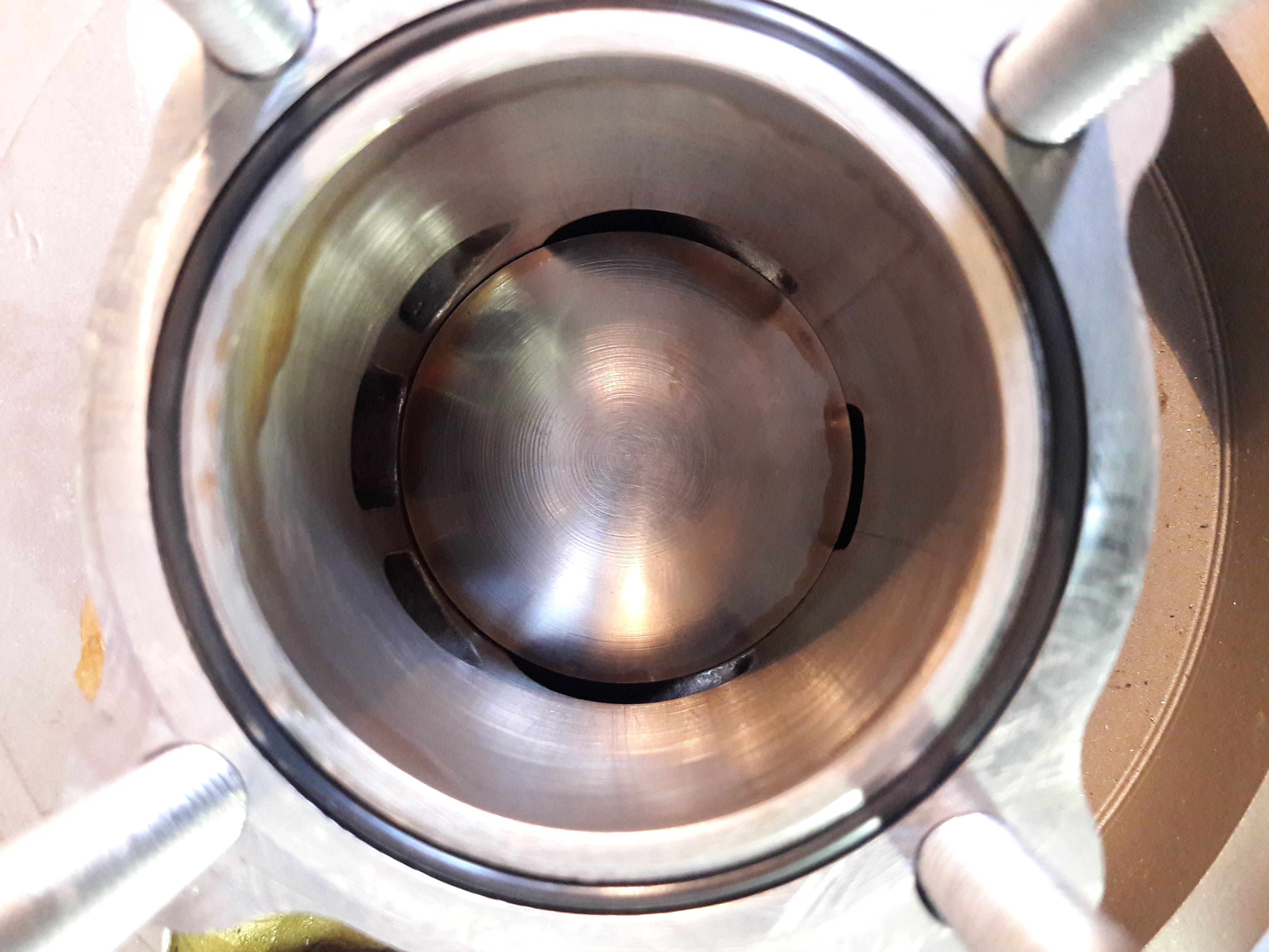 Idem, on va vérifier, j'ai même usiné une réhausse pour le bouchon de radiateur de façon à garantir que le raccord d'eau supérieur est bien noyé. Le Nikasil est plutôt propre, la géométrie du cylindre est correcte et l'embase à été reprise après coup pour garantir la perpendicularité.