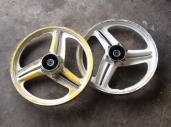 Vends deux jantes grimeca AR en bon état , juste 3 couches de peintures à décaper (jaune (origine) , blanc, et noir).