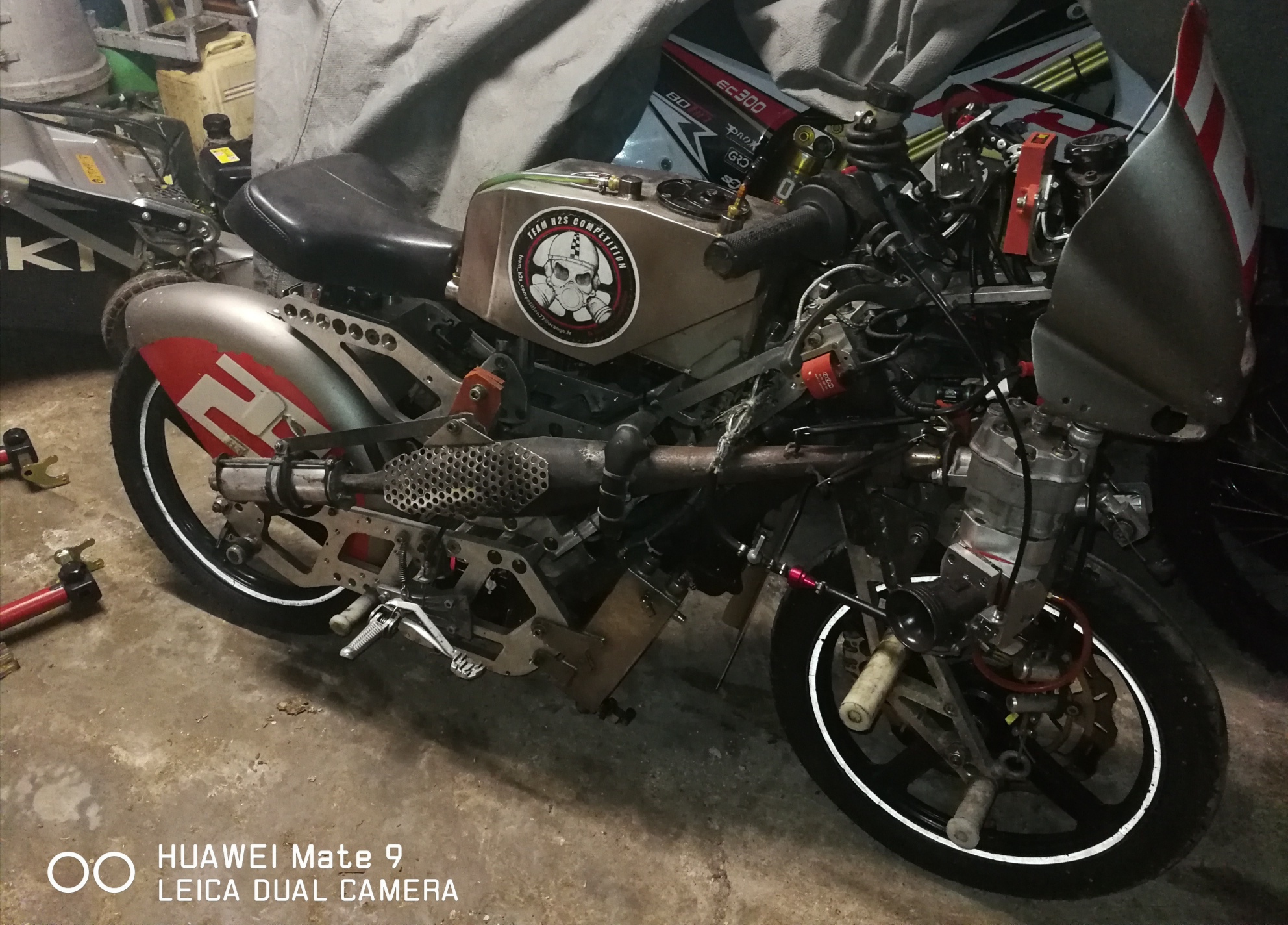 Pour rappel, c'est un châssis Ricky, full Aluminium très très robuste et stable. Dessus on a une pompe à eau Bosch, grand radiateur, jantes Ciao 16p, fourche massive, gros frein avec maître cylindre radial, selle 103 réglable, cirette et contre cirette au guidon, top bloc etc...