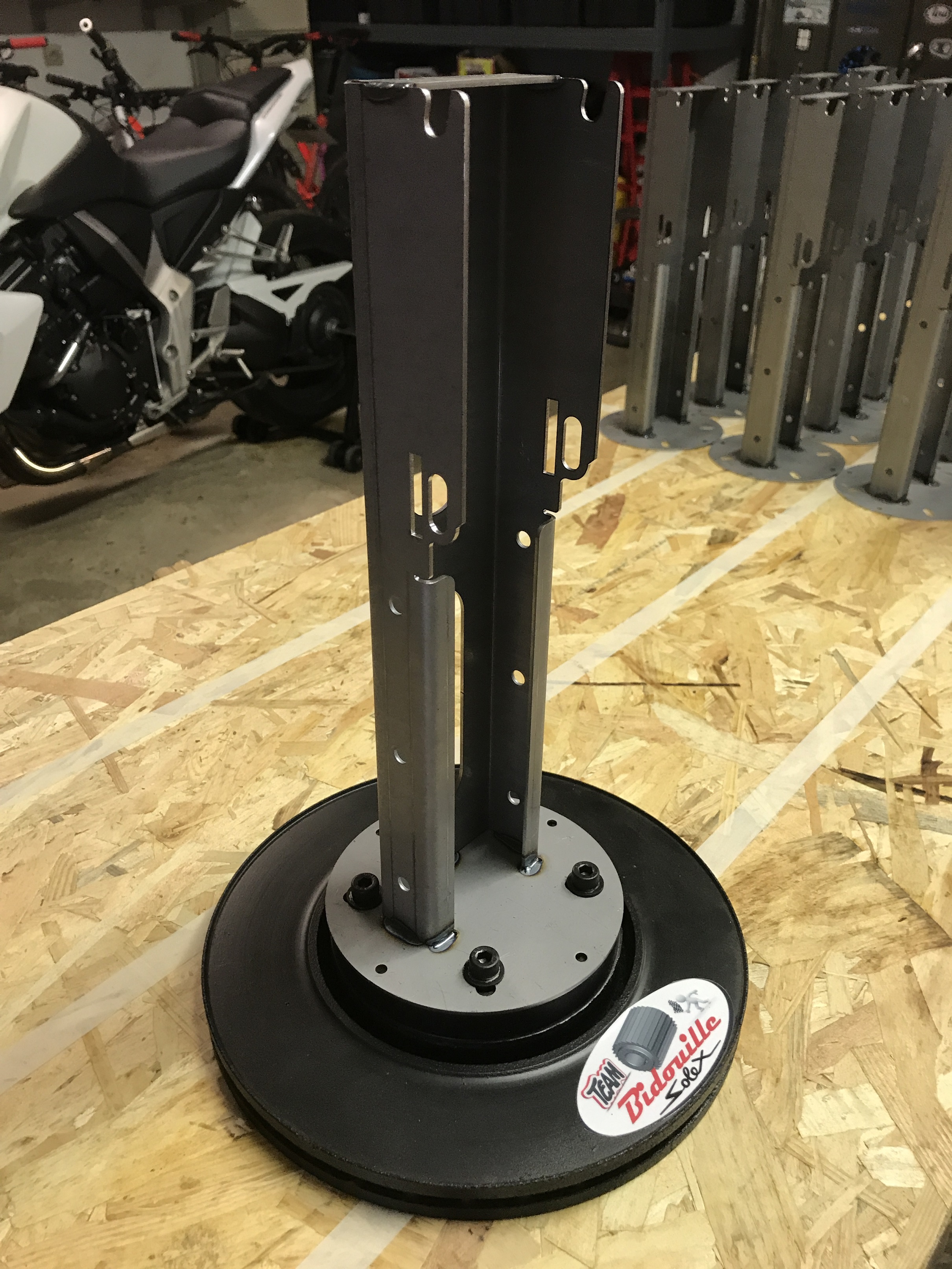 Il se fixe directement sur l'établi, ou sur un disque de frein de voiture faisant office de base....