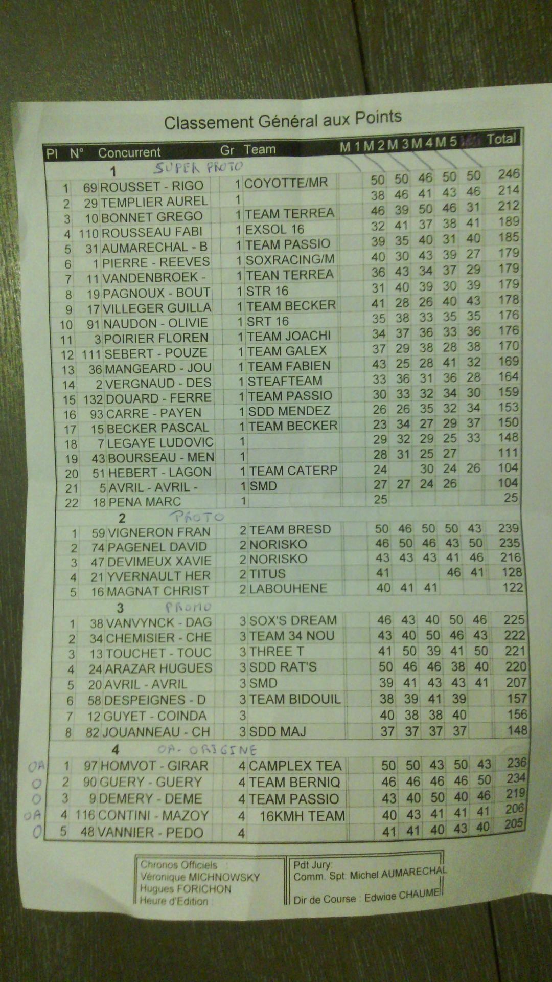 arrggllllll.... merci pour la feuille des classements Michel, ça me permet de confirmer ce que je craignais: on perds la première marche du podium O/OA de deux points pour 4/10ième de secondes dans la quatrième manche face au #97 (temps relevés à l'écran durant la course) :cry: