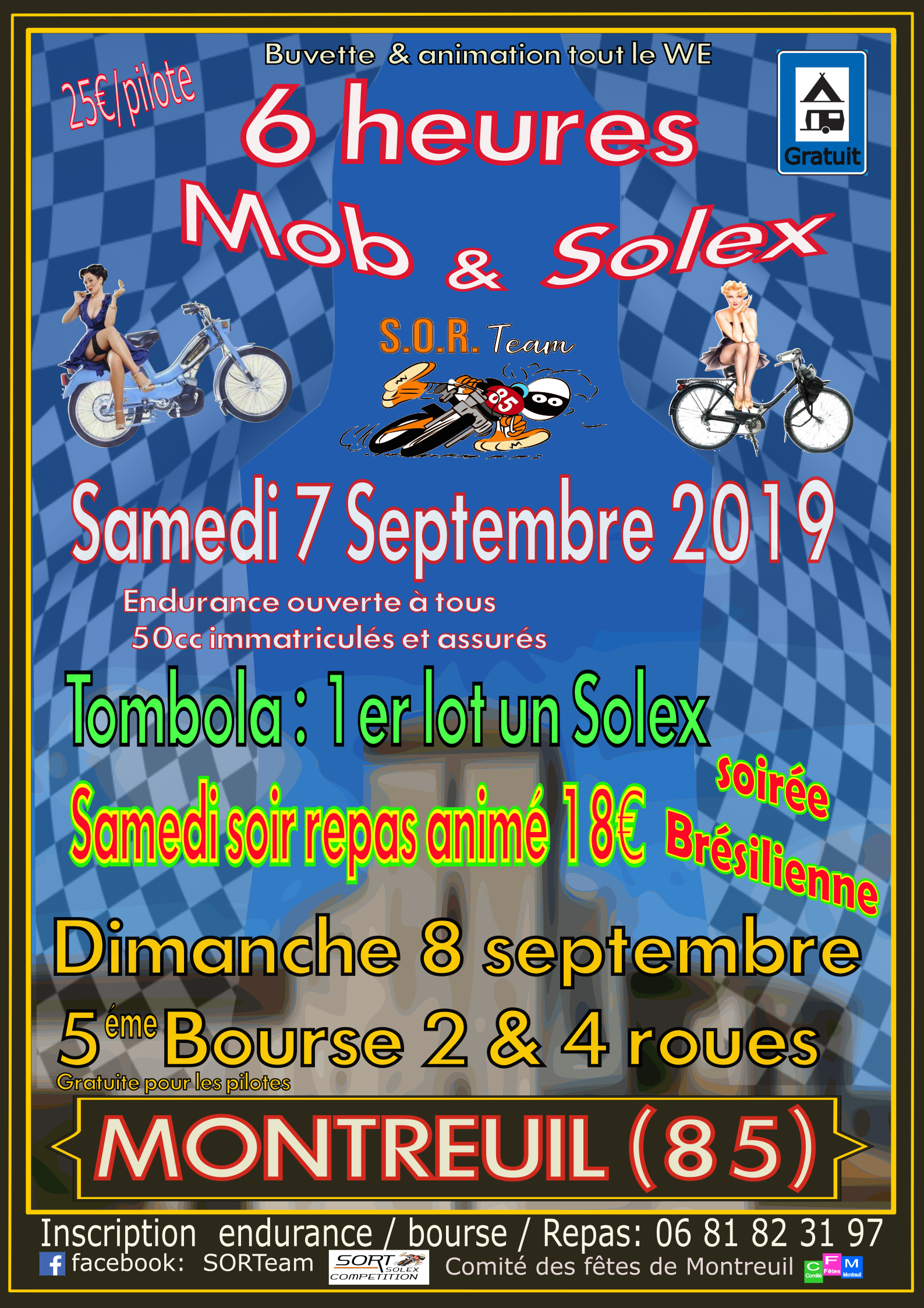 Ci dessous l'affiche du Week End Solex et mob que nous organisons le 7 et 8 Septembre 2019. Ce ne sera pas une course donc vous pourrez laisser vos montures au garage, par contre si vous avez un cyclo 50cc immatriculé vous êtes bienvenus. Gros WE en perspective avec endurance 6 heures le samedi, repas avec bandas Brésilienne le soir et dimanche bourse 2 et 4 roues (gratuite pour ceux qui roulent le samedi).