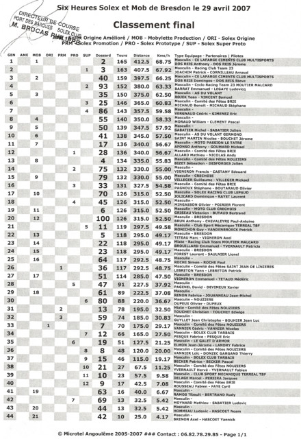 Le retour au calendrier de Bresdon a été officialisé le 29 avril 2007 et a donné lieu a de superbes empoignades. En voici en première livrée le classement officiel ! Une superbe course, de belles passes d'arme sous un soleil de plomb amené pour la circonstance par de généreux sudiste !! Un petit dommage pour tous les absents de ce rendez vous comptant pour le Trophée Grand Ouest !!! Pour s'en remmettre il leur reste encore 5 courses à disputer !! Prochain rendez-vous du Trophée: samedi 23 juin à Port des Barques ( 17 ) pour une endurance de 6H !!  4  |