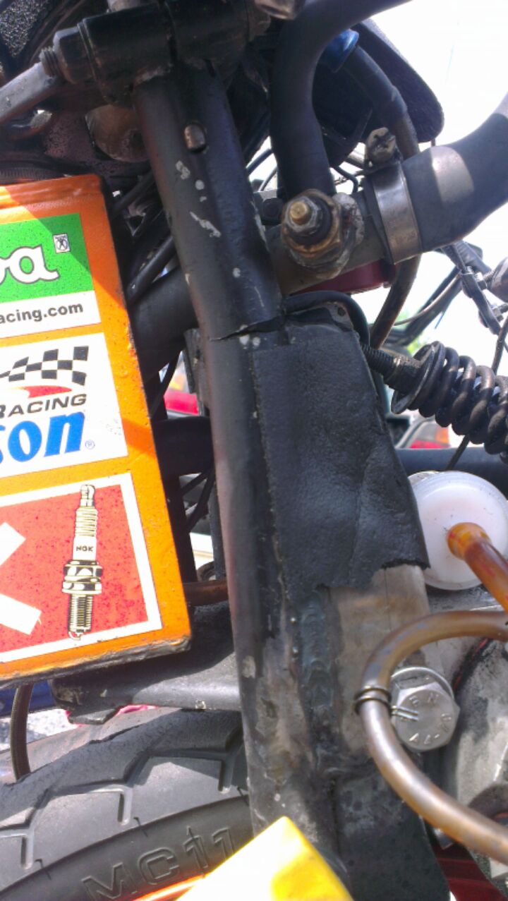 Les tubes se sont déchirées, la roue avant a happé le radiateur et celui ci c'est bloqué sous le T inférieur: