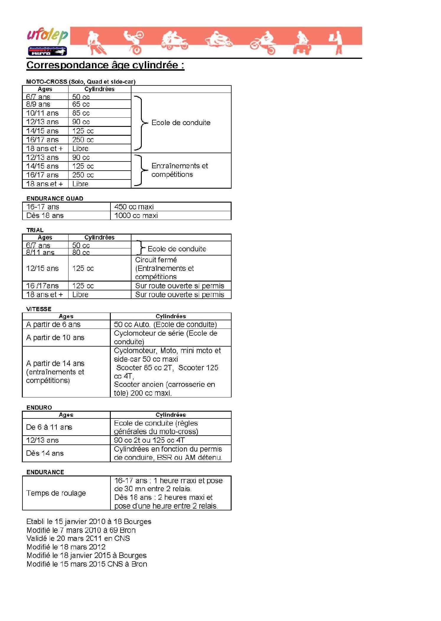 Le tableau age-cylindrée de l'Ufolep mise à jour en janvier 2015 à Bourges prévoit pour de l'endurance et des personnes de 18 ans et + d'autoriser des relais de 2h maxi séparés d'1h mini.