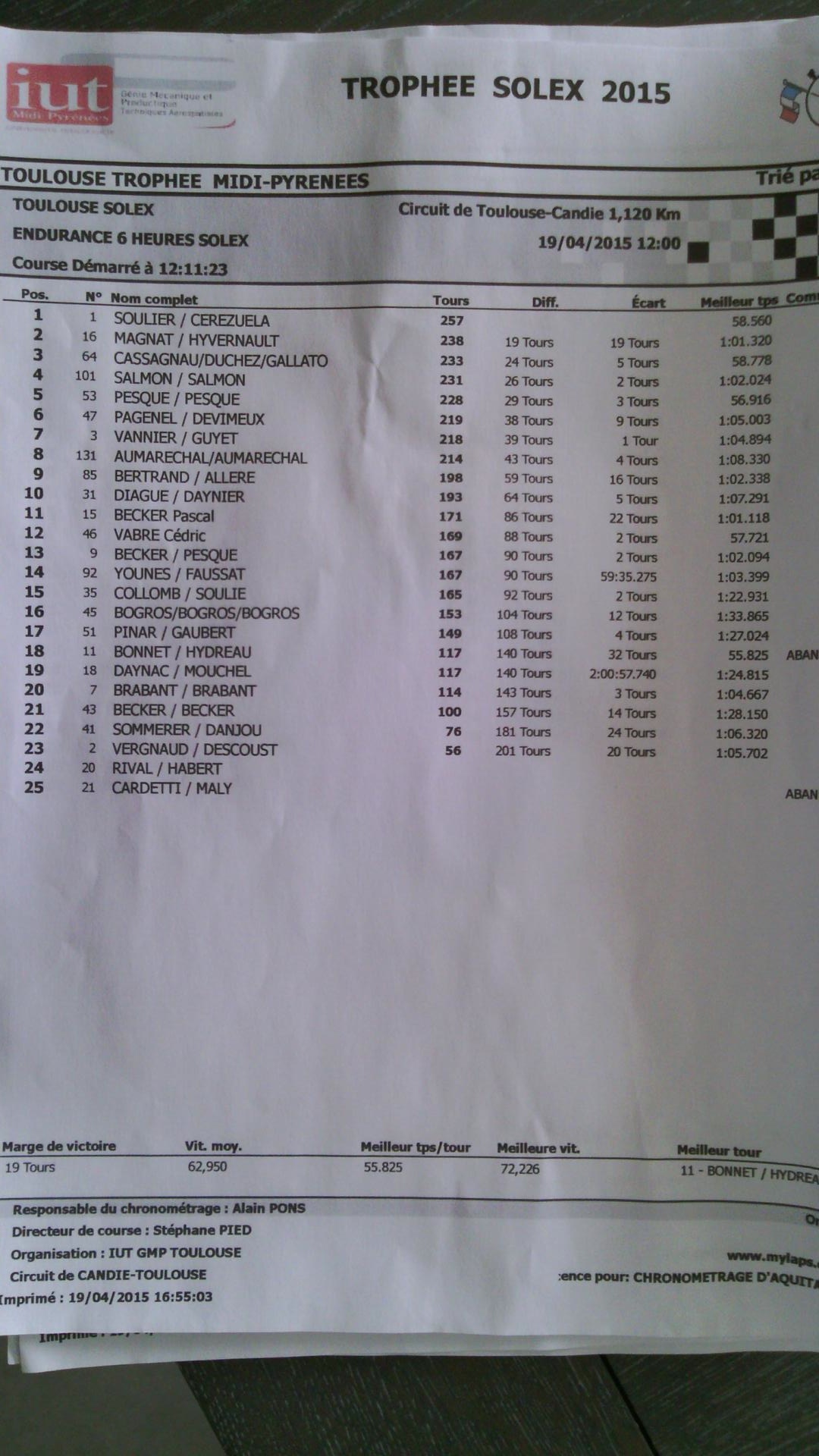 (Pour nous un peu déçu que la course s'arrête 1h15 avant l heure officiel, surtout quand on se lève a 3h30 du matin pour venir et rentrer le soir après et quand on sait que beaucoup de chose peu se passer en 1h15 et comme pour nous on est pas des performeur mais la fiabilité est en ce moment souvent la , . (fin de la paranthèse )