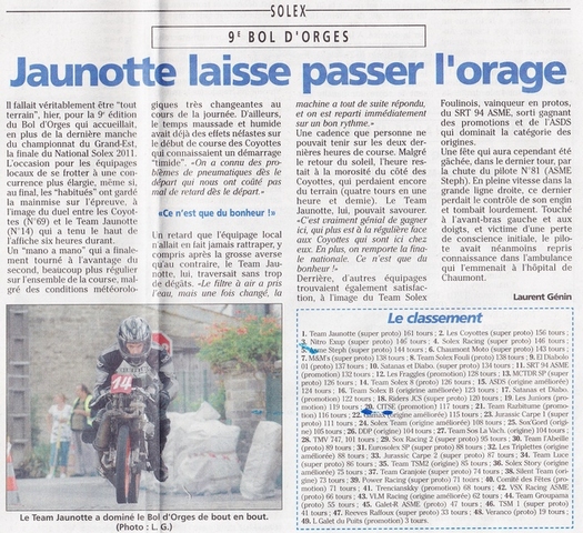 Juste une petite précision sur la philosophie de l'ASME quand je vois ce genre de réflexion: on est une bande de copain et on partage tout (pour le solex évidemment, pas pour le reste !). On pourrait faire comme certaines équipes et ne se concentrer que sur une seule machine mais chez nous on a plus de machines que de membres. Pareils pour nos moteurs: on a des pièces un peu partout et je ne compte pas combien de fois un de mes carters, vilo ou cylindre s'est trouvé sur la machine d'un autre. Certains, comme Solexgump font même des préparations pour les non membres de l'ASME et ce n'est pas Jean-seb Brest qui va s'en plaindre !.Donc difficile de dire que tel moteur est celui d'untel ou d'un autre et la seule chose qui compte pour nous c'est qu'il s'agit d'une machine de l'ASME. C'est Hadrien qui a mené cette machine à la victoire et le mérite ne revient qu'à lui (et à ses pilotes bien sûr)