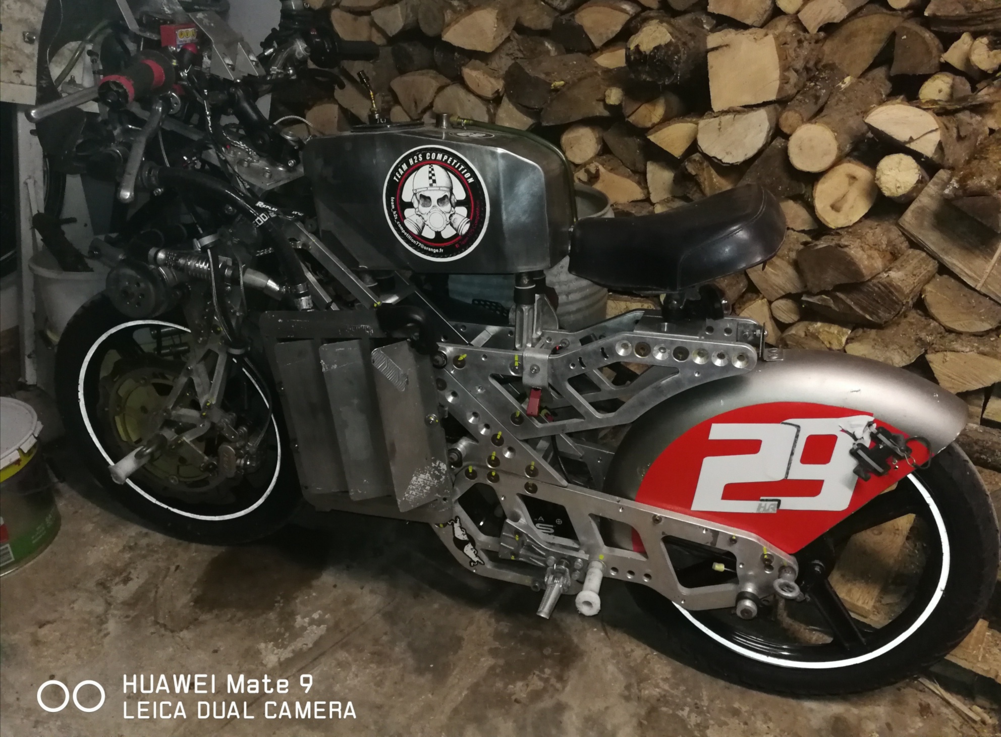 Pour rappel, c'est un châssis Ricky, full Aluminium très très robuste et stable. Dessus on a une pompe à eau Bosch, grand radiateur, jantes Ciao 16p, fourche massive, gros frein avec maître cylindre radial, selle 103 réglable, cirette et contre cirette au guidon, top bloc etc...